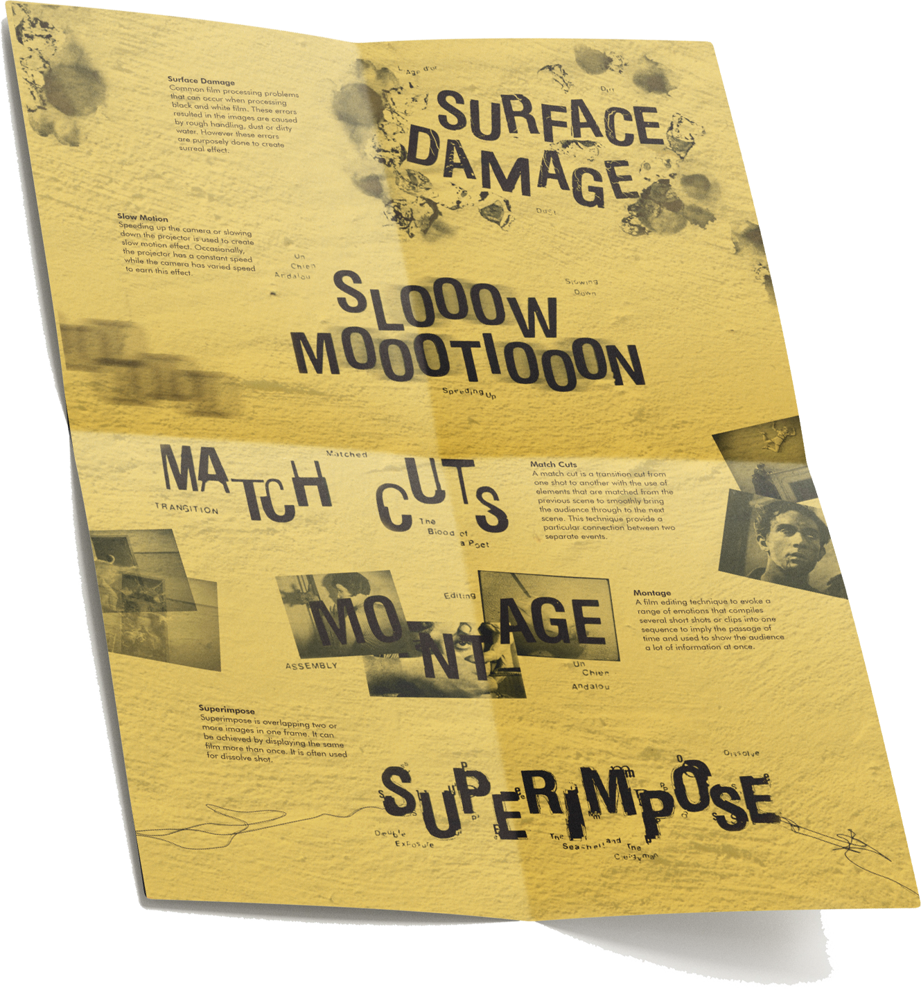 The use of letratone for the title is to achieve the effects that surrealist films created back then. The black color is based on the letratone color that I use to experiment with the artwork. It also represents the silent film that is still shot in black and white. The yellow color represents the further development of the silent film that is tinted and toned to create a better mood for the film.